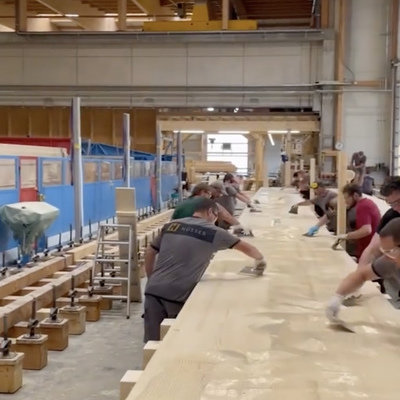 Furnituremakers among you undoubtedly remember your most difficult glue-up: A countertop, bench or tabletop of unwieldy dimensions. Well, you probably won't complain again, after seeing what these folks are doing. Swiss timber company Huesser Holzleimbau, which specializes in creating glue-lam beams, recently won a contract to manufacture two burly beams for a bridge.